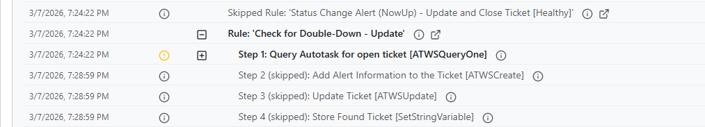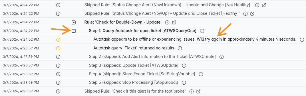 Once Autotask is back online, the next retry succeeds and the workflow continues as normal. If the outage was lengthy, you’d see a series of log entries, one roughly every 5 minutes, in the affected history records.