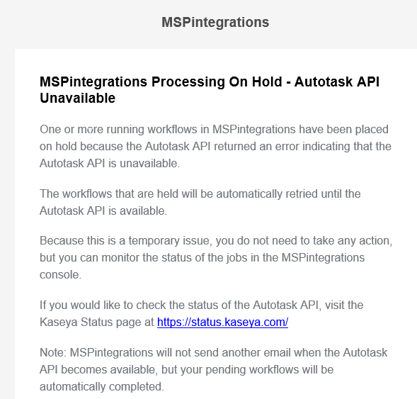 Logs a note to that message’s history indicating the Autotask API appeared to be offline